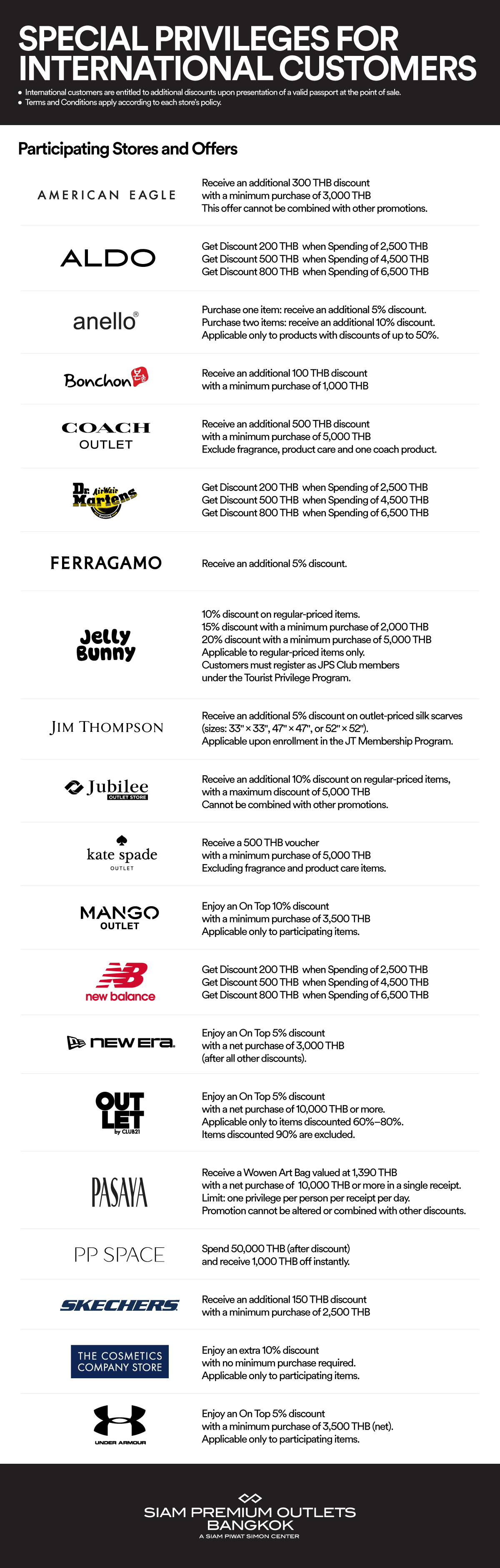 - Offers are valid only at participating brands and stores at Siam Premium Outlets Bangkok and are subject to each store’s terms and conditions.